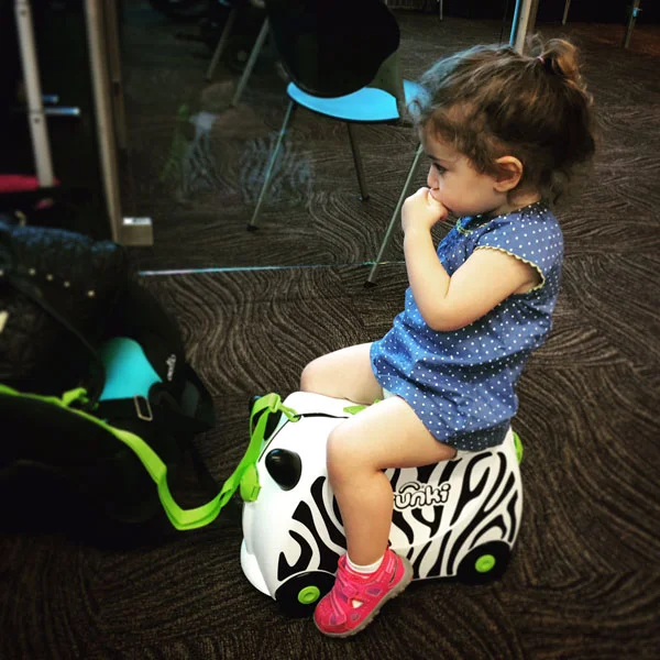 That was also the first flight we tried out Trunki, a ride-on suitcase for kids. Our 2.5 year old loved it! We didn't end up pulling her through the airport, but it gave her something to do while waiting at the gate. Since she loved to hang on to it and felt responsible for staying with it, it was a bit like having her tethered to her luggage.
