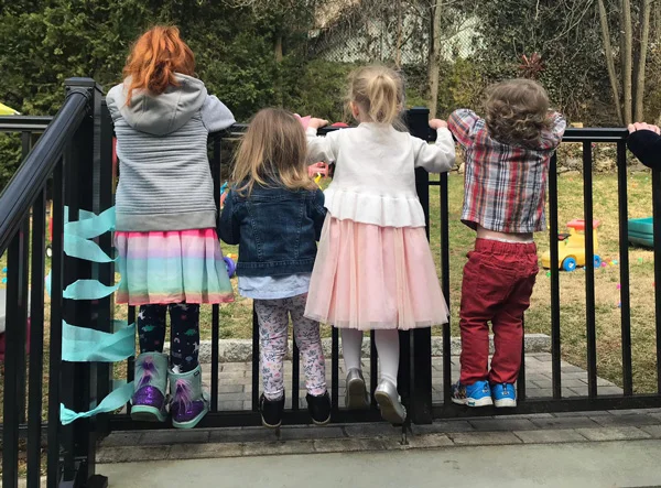 After all the eggs are in place, we gather where there's no access to the yard (for us it's our deck), and wait for everyone to arrive before we open the gates. I take the opportunity to find any older siblings and explain that their job is to find all the really hidden eggs in the back and let the babies pick up the easy lawn eggs.