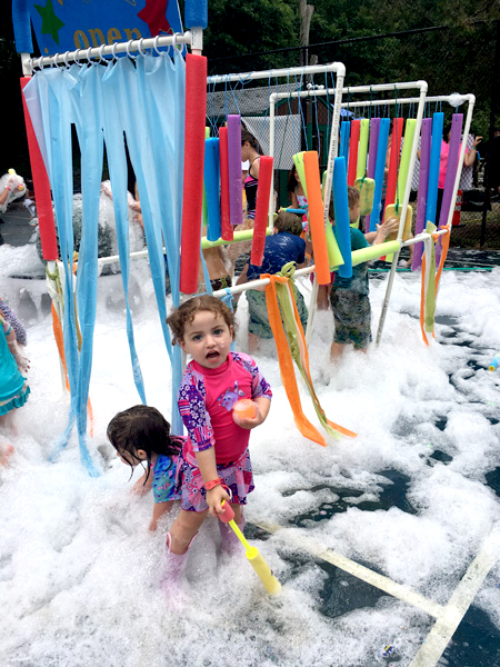 The event was from 11am to 4pm at the expansive grounds of the day camp. Visitors had access to four swimming pools, a lake with slides and logrolls, kayaking and paddle boating, basketball courts, tennis courts, a climbing wall, a golf driving range, a zip line, two playgrounds, mini golf, and much more. You could spend the whole day on those alone, but the Mess Fest also had tons of additional (messy) activities, including a food fight area, muddy puddles to jump in, splatter painting, a “kiddie car wash” foam machine, whipped cream pie toss, mud pit, and dirty dunk.