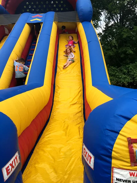 A balloon pop, arts and crafts, temporary hair color, balloon twisting, face painting, henna tattoos, nail art, three inflatable activity slides, a giant slip n slide set up hillside, an obstacle course, tye dye station, bounce station, candy sushi making, kiddie bingo, sensory art, and treasure hunts.