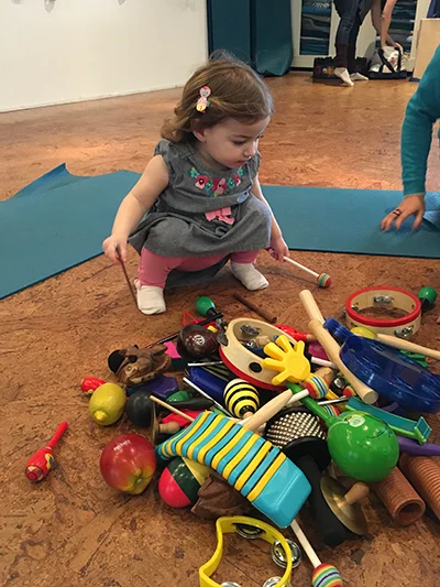 The class wound down with free play with a giant pile of kid-friendly instruments and noisemakers for the children to explore.