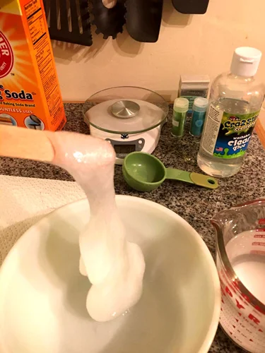 - Slowly pour the baking soda solution into the glue, mixing with the craft stick. You will see the slime starting to form immediately. There will be a lot of baking soda solution left over.