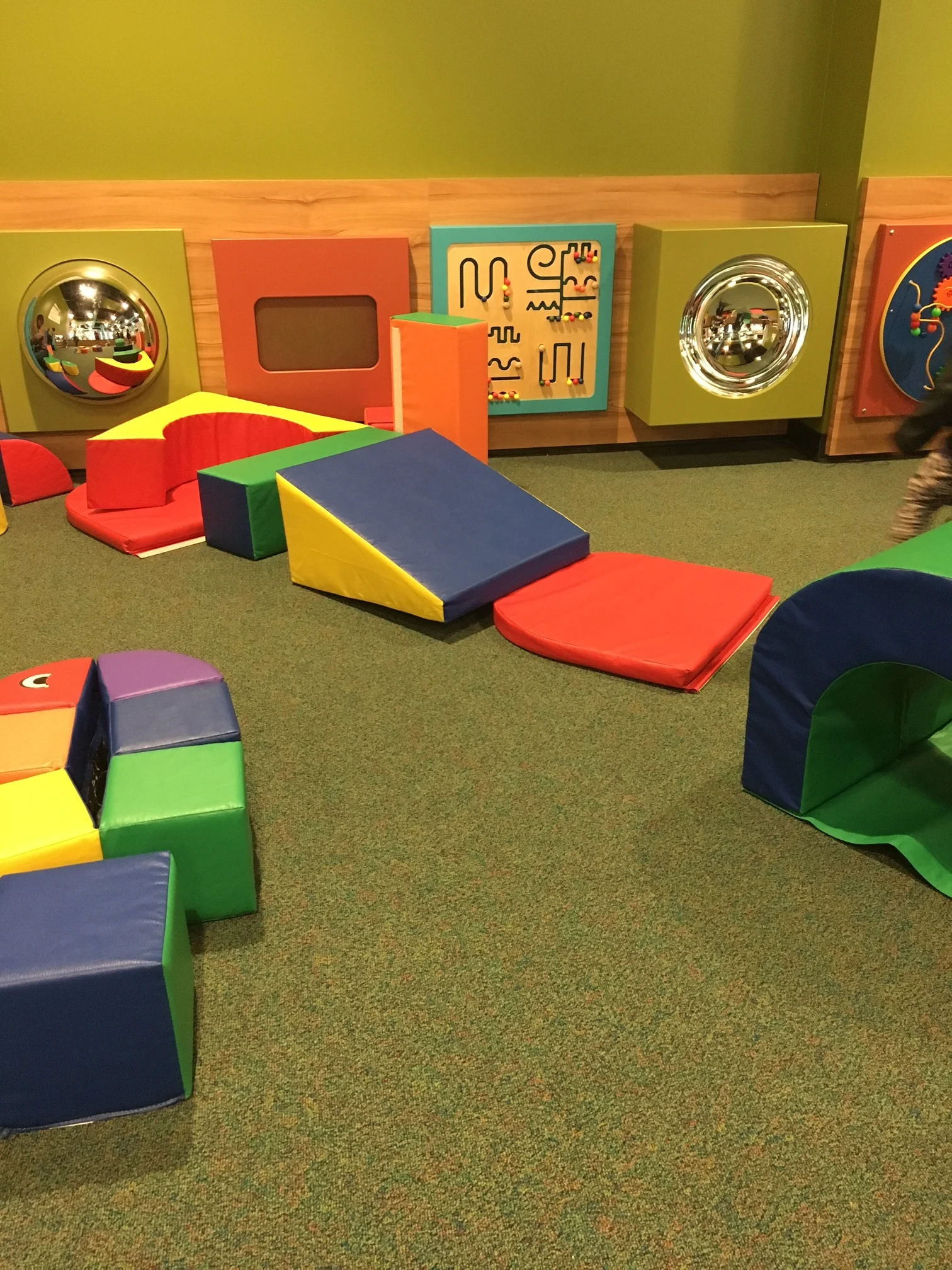 The space is one large room divided into a few zones. It’s very open, but there is an area geared toward younger kids that is sectioned off with a row of benches. Place your crawler or early walker inside, pop down on the bench, and they are safe and contained until you’re ready to go. The only issue is that to get into the space, you have to climb over the large padded bench, so it might be a pain to go and get them. Inside are lots of gym mats and wedges and a wall full of sensory pieces like mazes, mirrors, and busy beads.