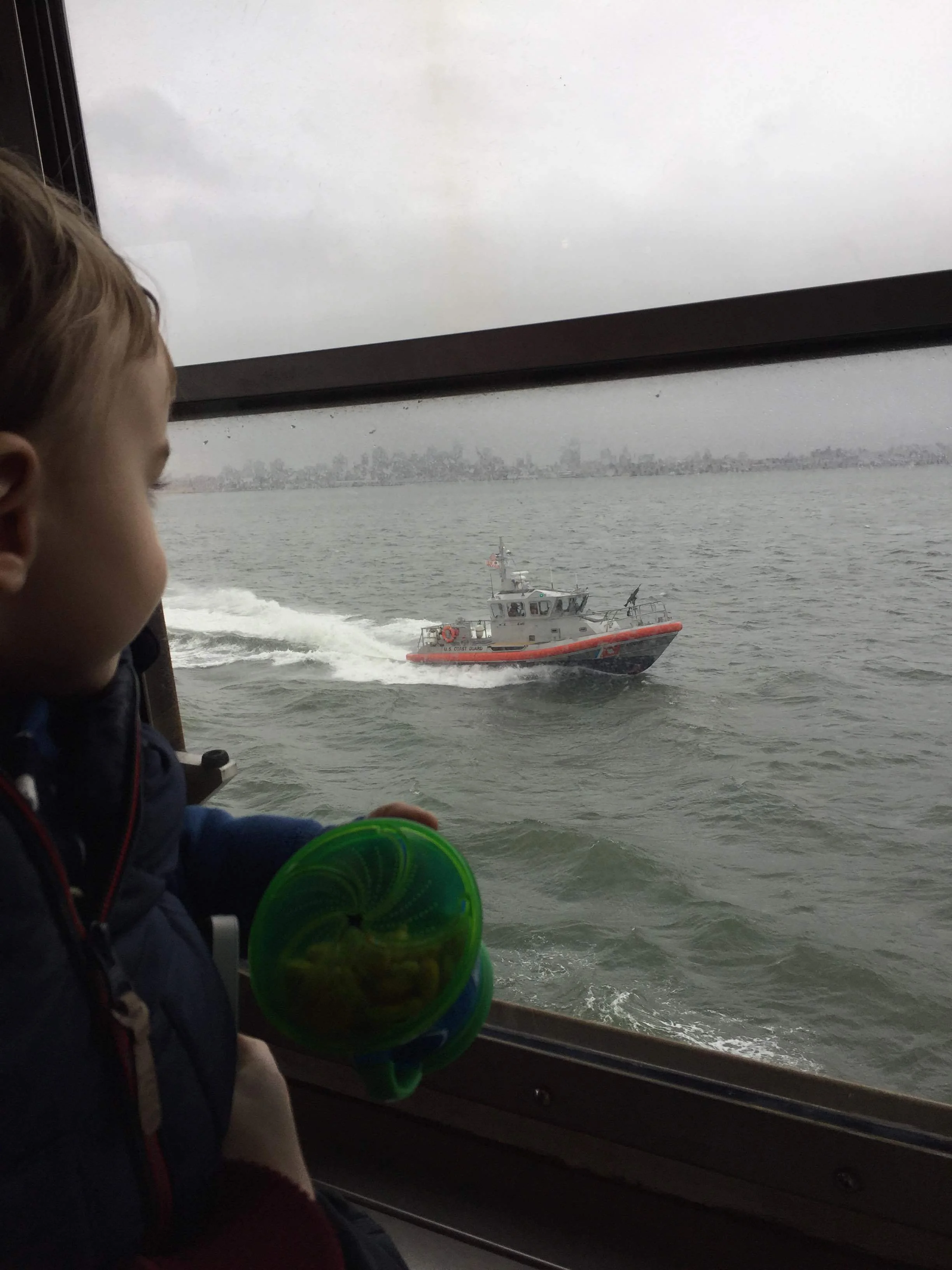 Years ago on my first trip to NY, we discovered that the Staten Island Ferry is a free alternative to seeing the Statue without paying tourist dollars. So one cloudy day this week, we revisited and hopped on the Ferry across to see the Statue. My son loves any form of transport and going on trains and buses are some of his favorite activities, so when he got to go on a boat he was in his element! He loved running around and looking out the window on the short trip across. I’d love to tell you what we discovered on the other side but it started raining then so we just turned around and came back.
